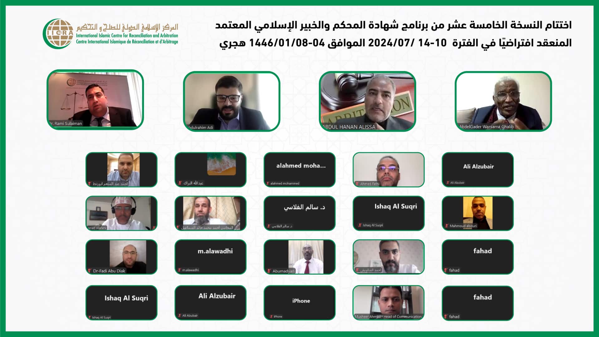 اختتام النسخة الخامسة عشر من برنامج شهادة المحكم والخبير الإسلامي المعتمد المنعقد افتراضيًا في الفترة 10-14 /07/2024 الموافق 04-01/08 /1446 هجري