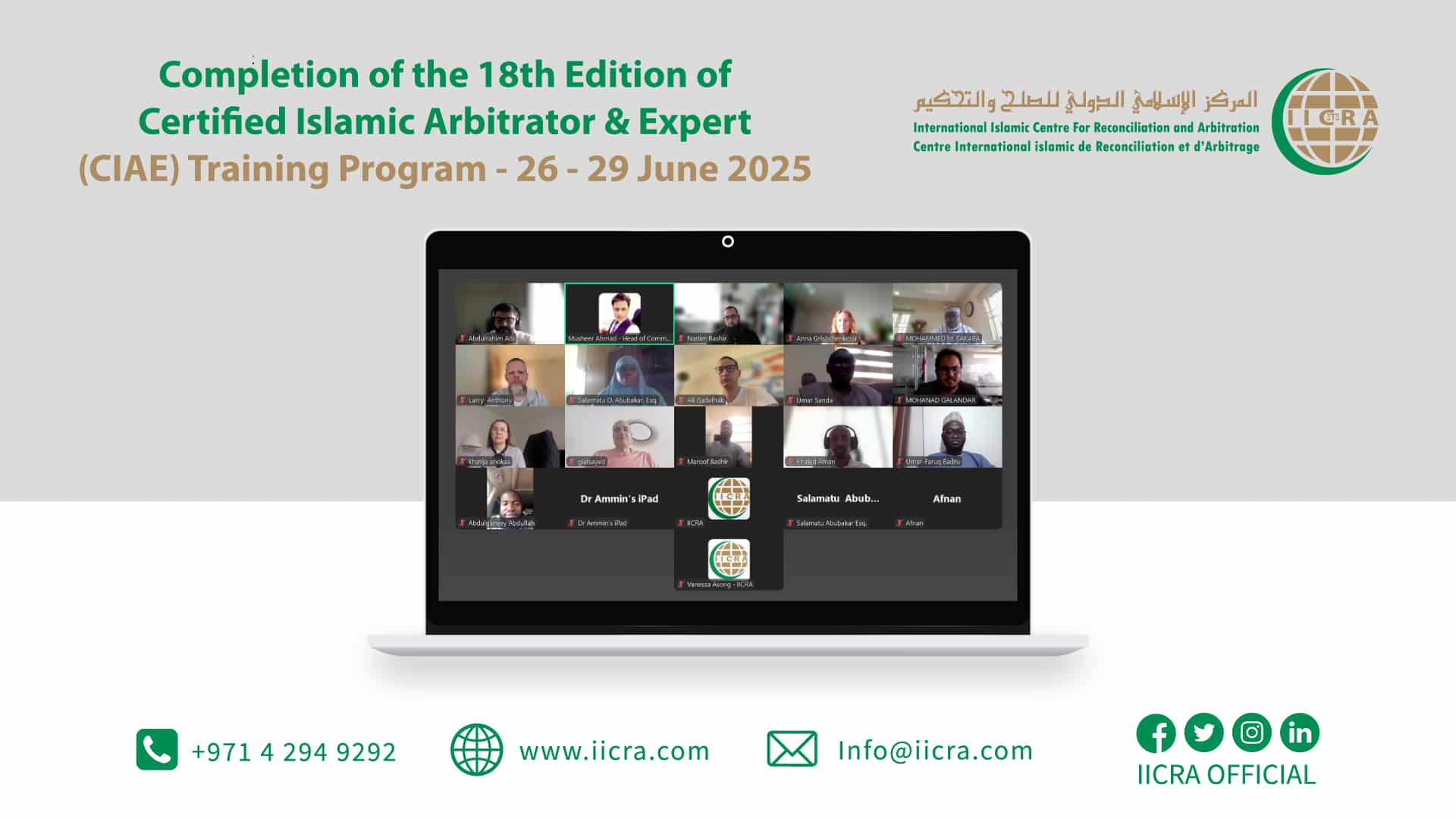 The International Islamic Centre for Reconciliation and Arbitration (IICRA) has successfully concluded the 17th edition of the CIAE Training Program. The five-day program, comprising 30 training hours, featured intensive academic sessions and culminated in a written examination held on Thursday dated 24 April 2025.